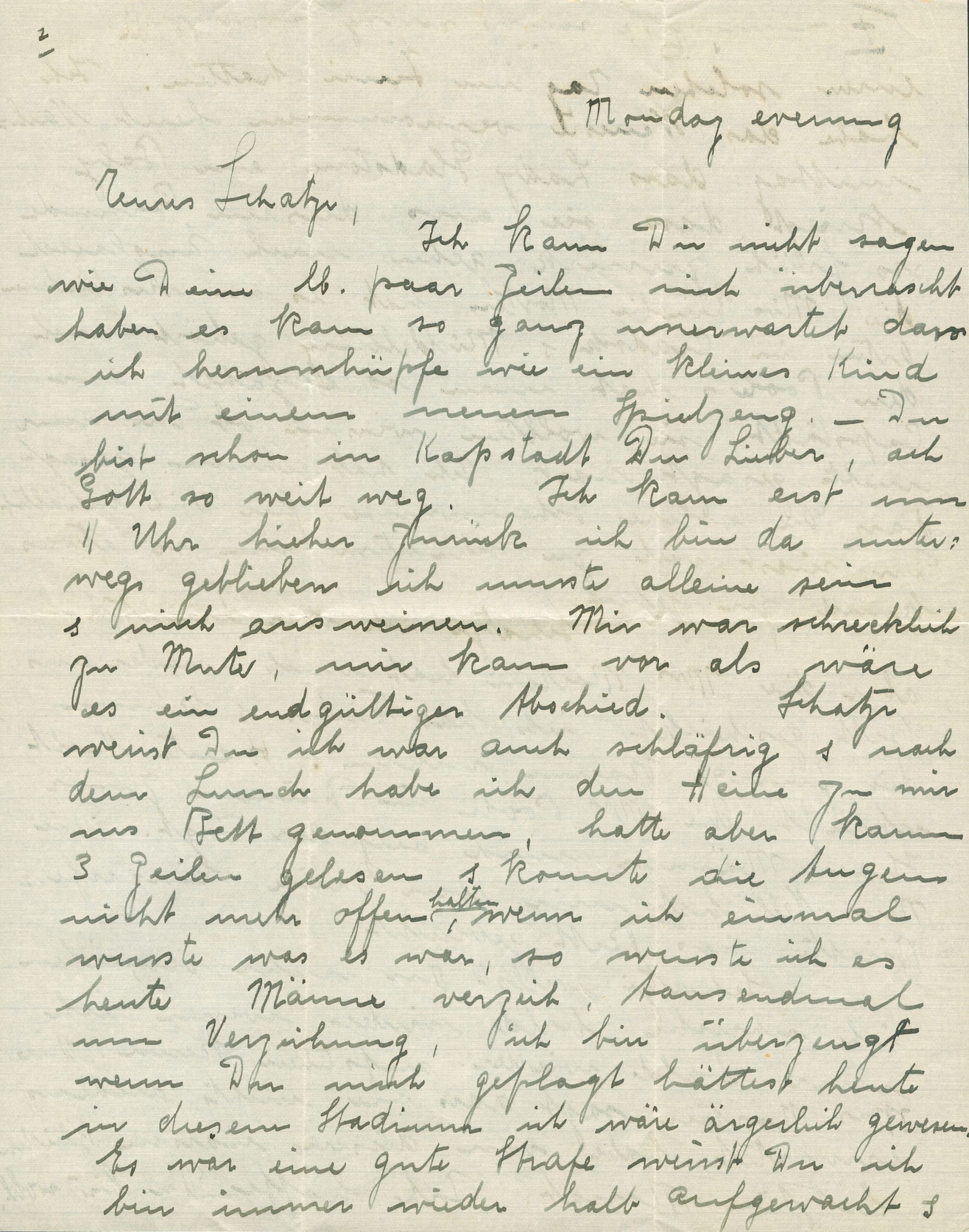 I can’t tell you how surprised I was by your dear few lines — they came so completely unexpectedly that I’ve been skipping around like a little child with a new toy. You’re already in Cape Town, my dear — oh God, so far away.I only got here at 11 o'clock; I had to stay for a while. I had to be alone and cry it out. I felt terrible; it seemed as if it were a final goodbye. Darling, do you think I was sleepy too? After lunch, I took the blanket to bed with me, but I had barely read three lines before I couldn't keep my eyes open any longer. If I ever knew what it was, I knew it today — men, forgive me a thousand times. I’m sure that if you had teased me today, in this condition, I would have been annoyed. It would have been a good punishment if you had — I keep waking up halfway again and I heard your voice, or maybe I was just imagining things. Four times I ran to the window, thinking you had just arrived. Then suddenly came the painful awareness that you were far away, sitting on the train — perhaps cold and uncomfortable. It was strange: every time I half fell asleep, the same vision and noise returned to me.