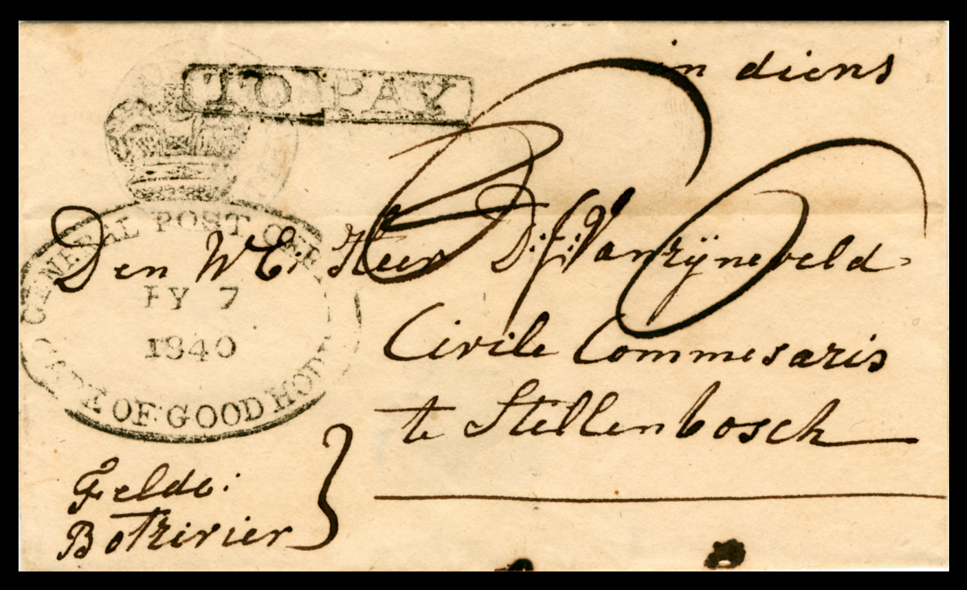 1840. Cover. BOTRIVIER via CAPE TOWN 'FY 7 1840' to "Civil Commissioner" STELLENBOSCH.