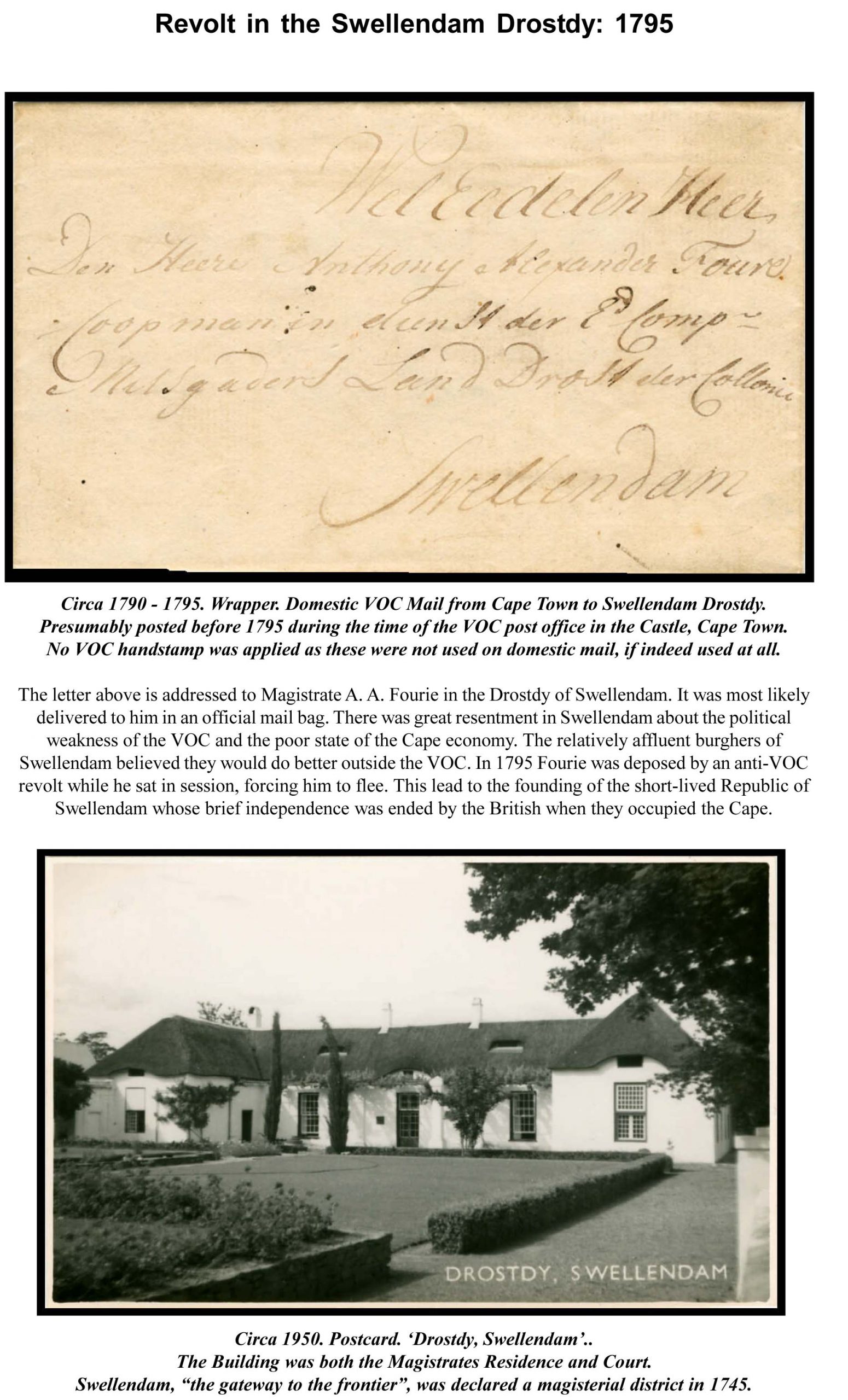 Second full drostdy beyond Stellenbosch, established under Governor Hendrik Swellengrebel to serve the Overberg region and frontier farmers. First landdrost: Pieter van der Byl. |