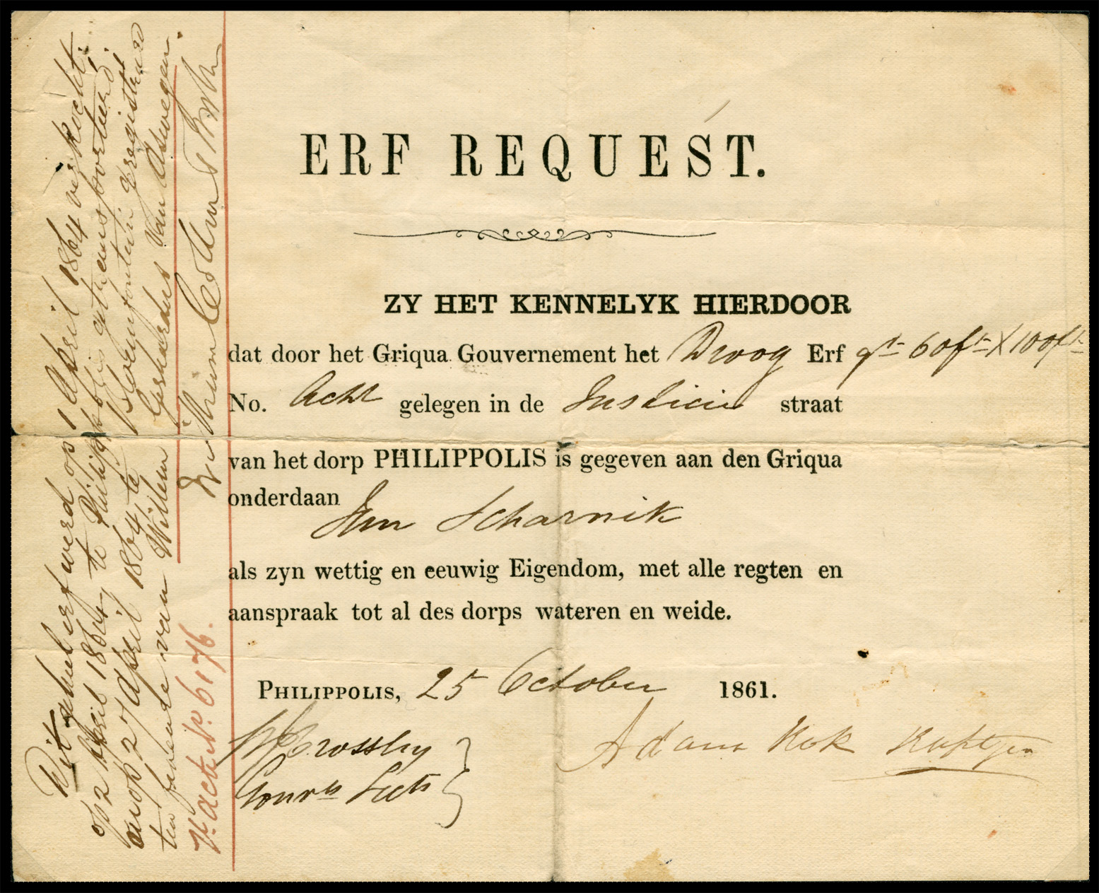 1861. ERF REQUEST '25 October 1861' in PHILIPPOLIS by Adam Kok, Kaptejn.