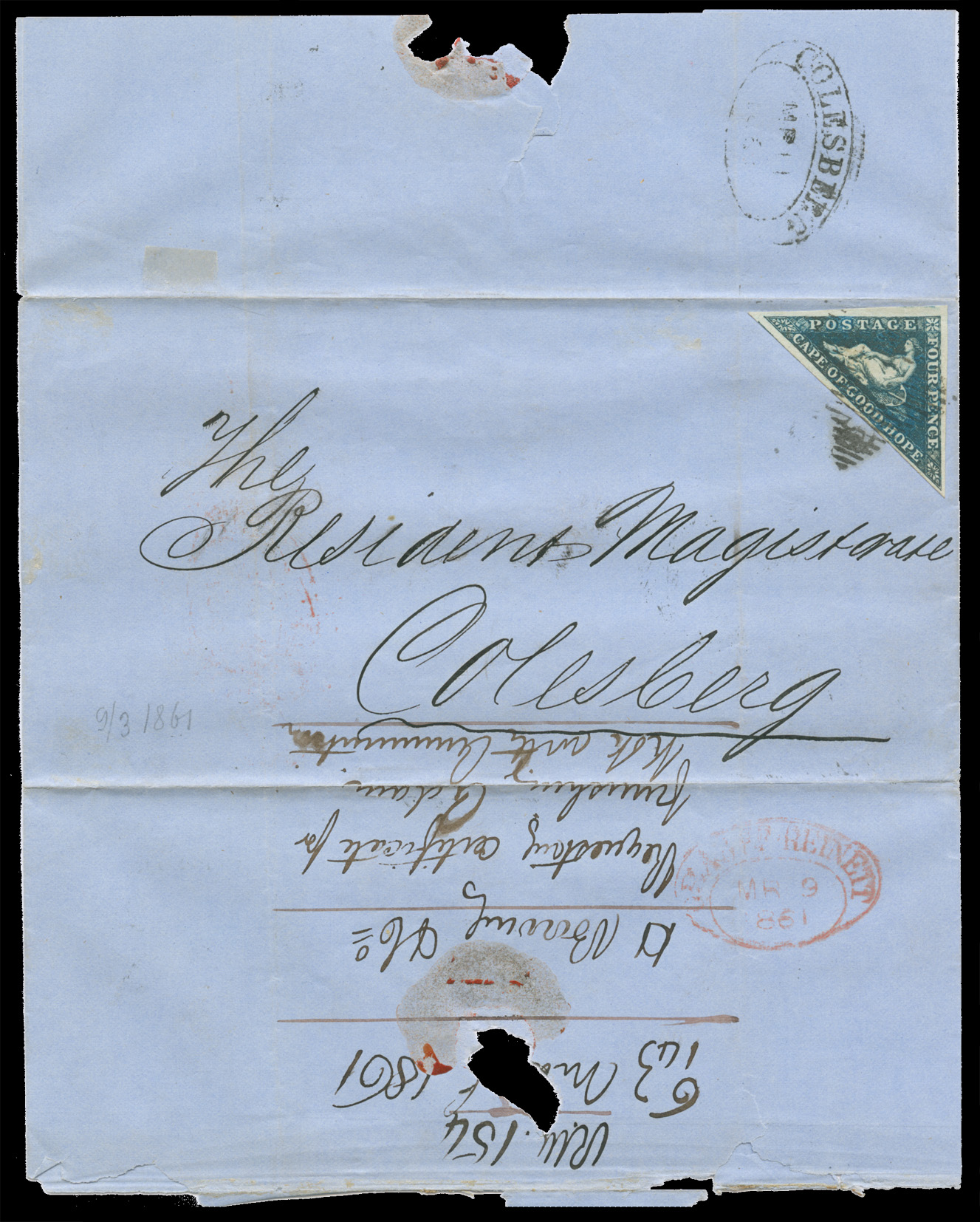 1861. Cover RM (Resident Magistrate) GRAAFF REINET 'MR 9 1861' to RM COLESBERG 'MR 11 1861'.