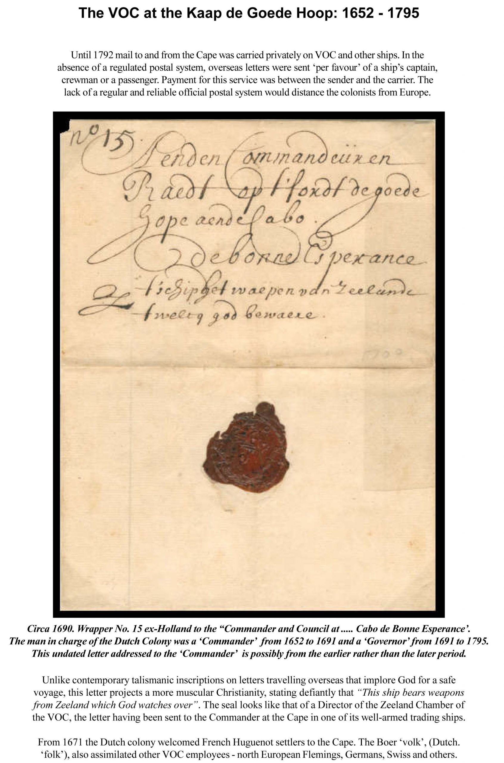 The above letter's contents reveal that the writer had arranged forRev. Dr John Campbel to deliver this letter to Rev. Anderson at Klaarwater. It is believed to be one of the first, if not the earliest, letter to be delivered north of the Orange River. (1819.)