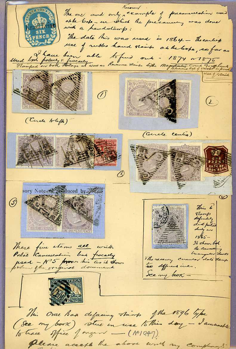 and embellished original postal history covers from the Cape and Bechuanaland.with stamps and or false postmarks. Among the later he specialised in adding Cape revenue stamps and bisected triangles to genuine covers. Caveat emptor.