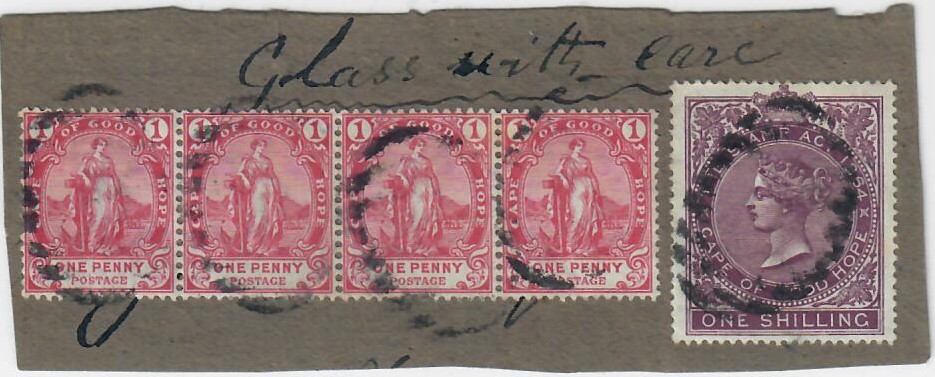 I think this sheet was sent to Robson Lowe, when he was researching his Encyclopedia volumes. I cannot trace it to a particular date. I bought it many years ago from a reputable dealer as "Jurgens fakes" who stated it was from the Robson Lower archives. I thought at the time it would have made a good appendix to a Cape Stamps postmarks. The piece has in ms Glass Handle with Care. and the high value revenue makes sense for a small packet.