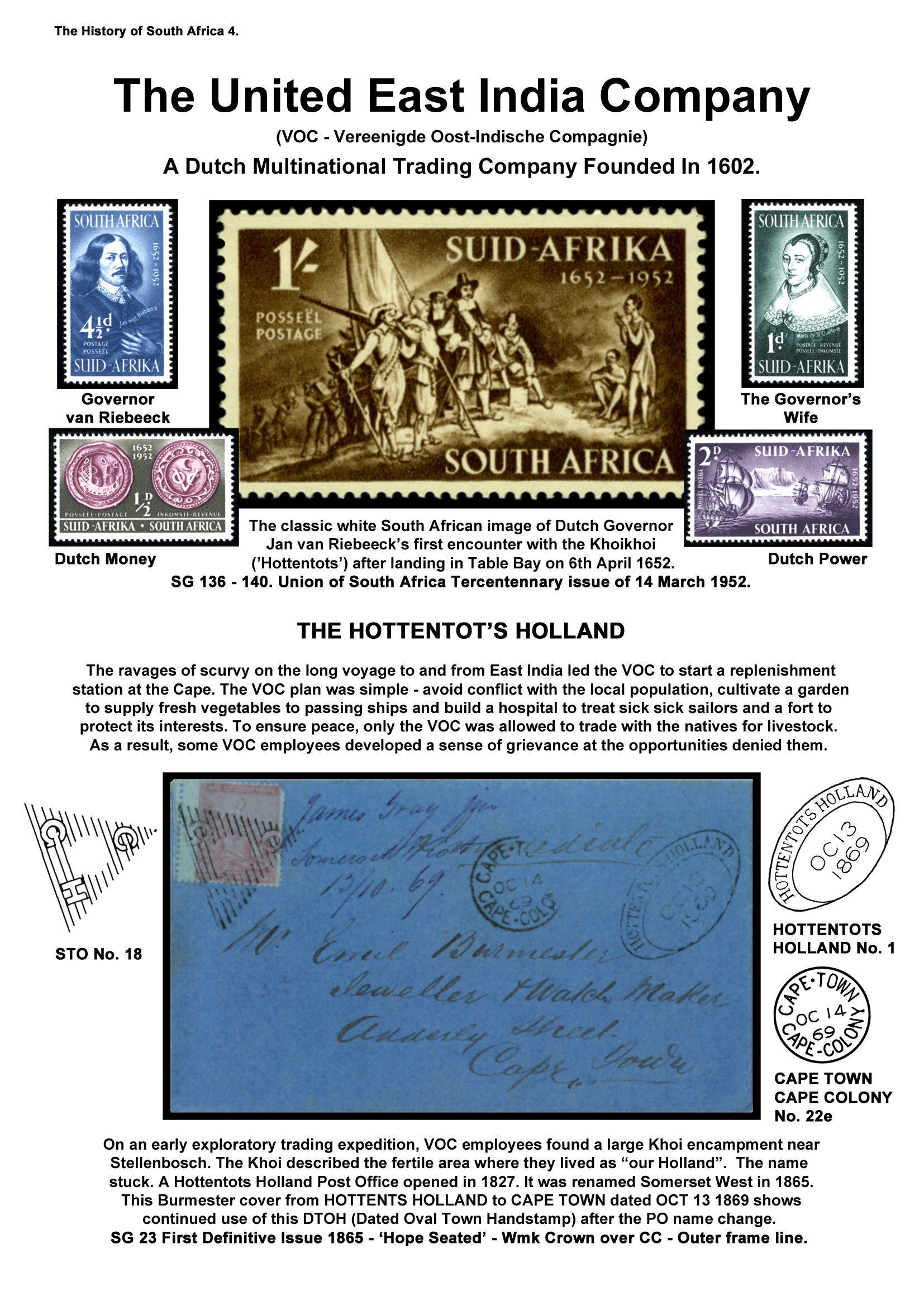 A Hottentots Holland post office was established in 1823. According to Ralph Putzel's 'Encyclopedia of SA Post Offices and Postal Agencies' the first postmaster was H. R. Vos on an annual salary of £7 10/-. An Octagonal Numeral obliterator was supplied to the Hottentot's Holland Post Office in "* * 1850", according to Franco Frescura and Alex Visser (Post Offices and Postal Markings of the Cape of Good Hope 1792 - 1910). Its DTO (Dated Town Oval) was first seen on 21 AP 1853 and last recorded on 4 JY 1876.