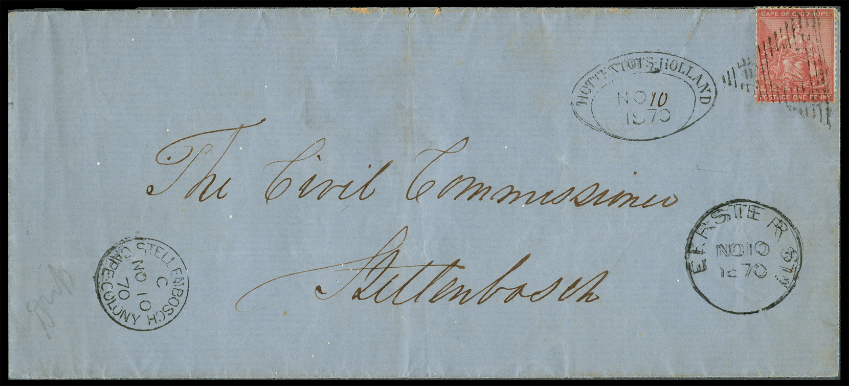 1870. Same day cover. HOTTENTOTS HOLLAND 'NO 10 1870' via ERSTE RIVER STATION to STELLENBOSCH.