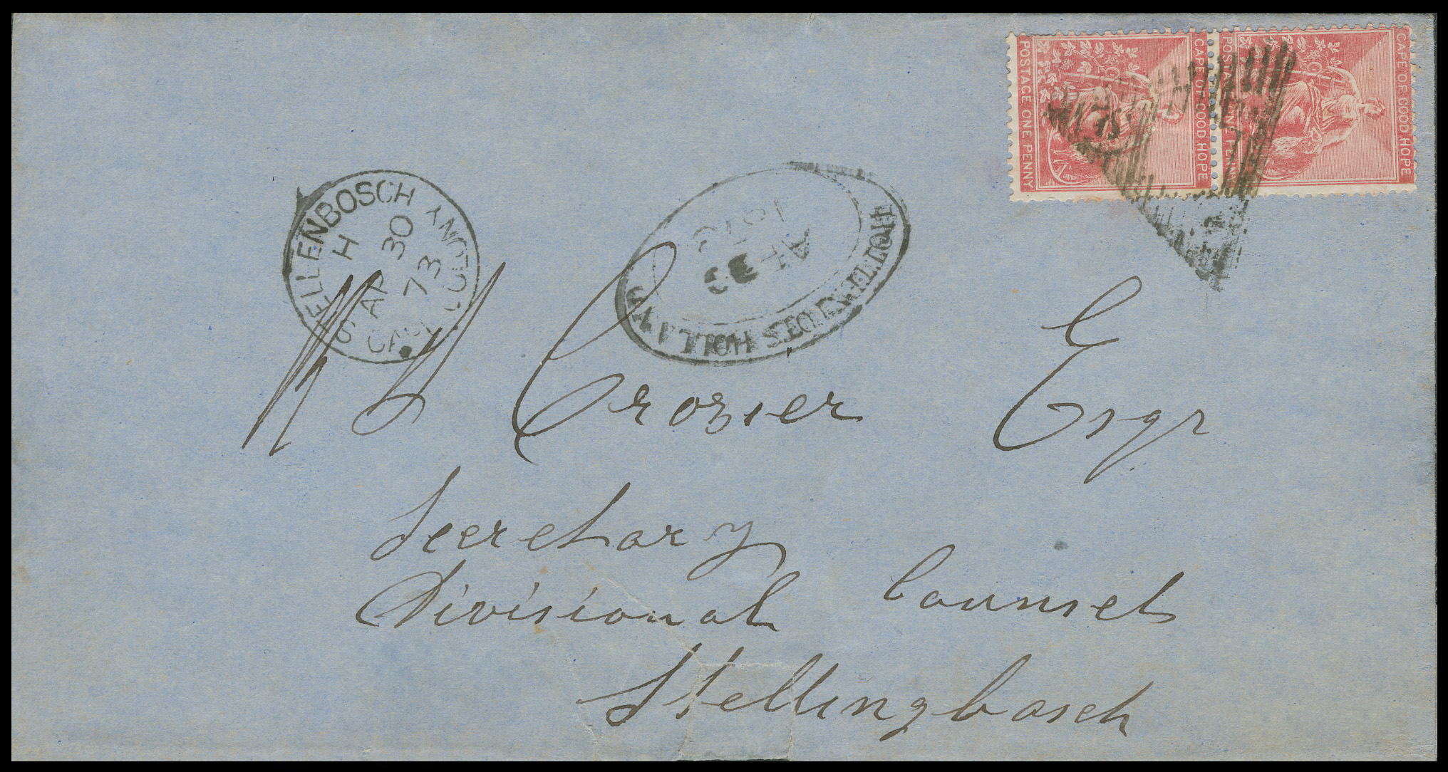 A Stellenbosch single circle arrival datestamp shows same day delivery, typical of local Penny Post.As Stellenbosch was the first town to be founded outside the Dutch settlement below Table Mountain, it has had a connection to the Cape Post Office for as long as one has existed in South Africa. Founded in 1679 by Governor Simon van der Stel and named after him (Dutch. Stel's Forest). The French Huguenots, who arrived in the 1680s, played a key role in establishing a long-flourishing wine industry. Stellenbosch became a Drostdy (Dutch. a magistracy), developing as an important agricultural settlement with a mixed population of European settlers, slaves and indigenous Khoi. Known today for its preserved Cape Dutch architecture, it is a center of Afrikaans culture and learning. It is the home of a prestigious university whose playing fields make South African rugby a mighty force for positive change in a broken and divided country betrayed by corrupt and incompetent politicians.
