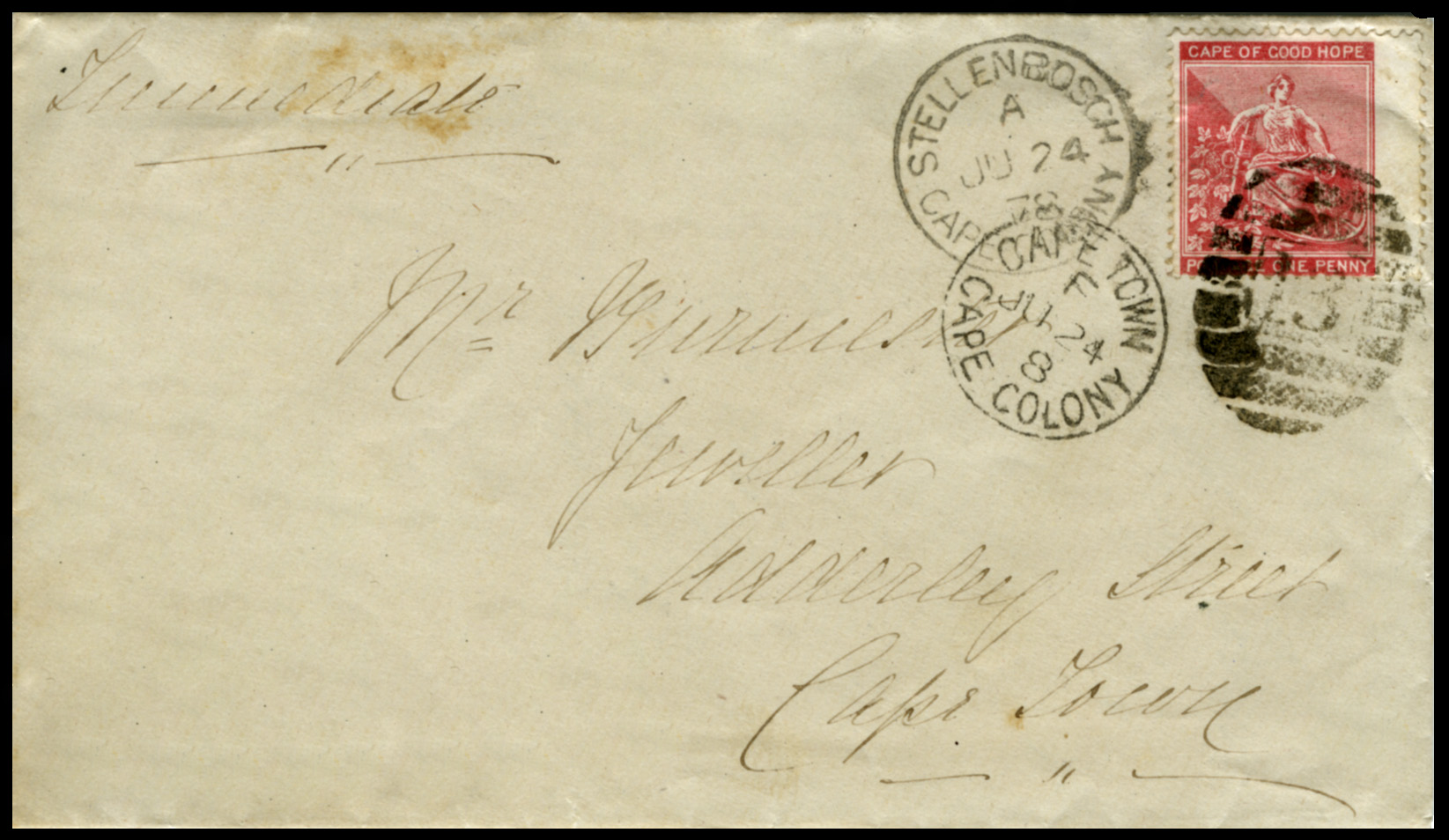 A Cape Town single circle arrival datestamp shows same day delivery, typical of local Penny Post.