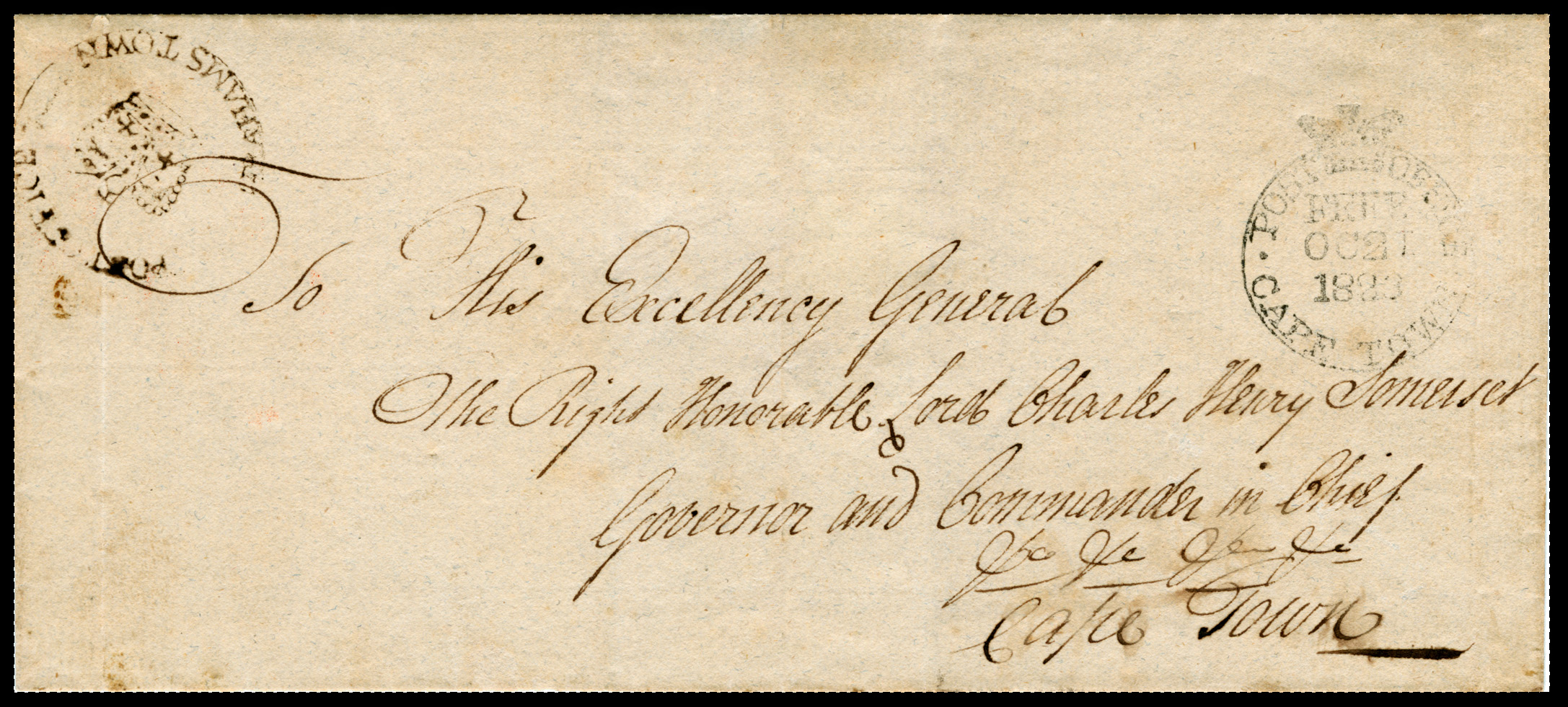 Confusingly, there are two 'Somersets' in the Cape. Lord Charles Somerset, Governor of the Cape, (1814–1826), founded a tobacco farm in the Eastern Cape. It was supplied with the SOMERSET CiC (Crown in Circle) handstamp in 1823. (Goldblatt.) When this venture failed the town of Somerset East was founded on the farm in 1825.