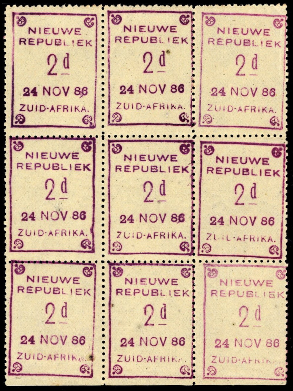 Click here to visit the Grosvenor Auction website.Nieuwe Republiek stamps were issued between 9th January 1886 and 13th January 1887. All stamps were handstamped using a rubber stamp in various shades of violet on pre-perforated, unwatermarked gummed paper. Designs have an outer frame line with NIEUWE / REPUBLIEK top, the value of the stamp in large letters in the centre, often date below the value and ZUID-AFRIKA at bottom.