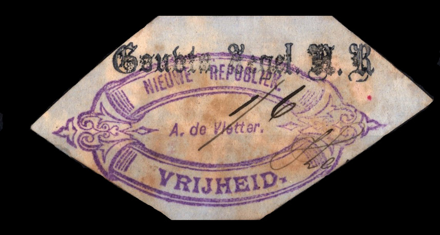 Circa 1886. Fiscal piece. VRIJHEID rubber stamp buckle design inscribed Nieuwe Republiek