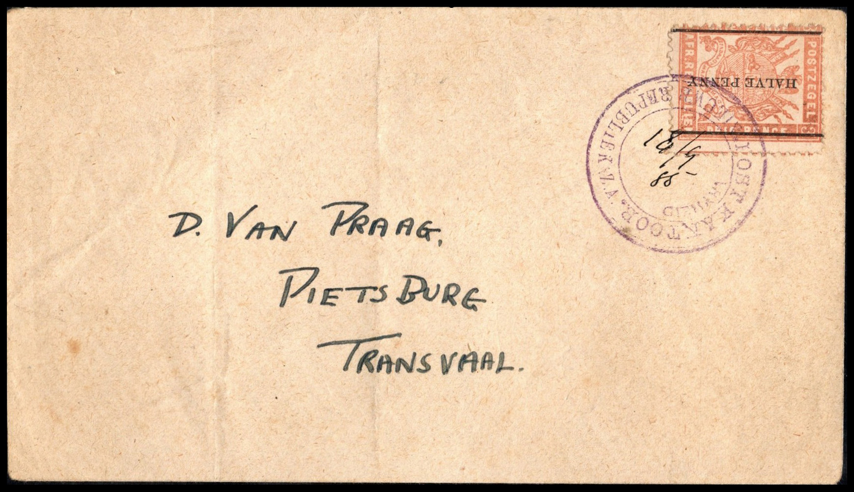 1885. Pre-New Republic postage stamp cover. NEW REPUBLIC m/s '18 8 85' to PIETSBURG, TRANSVAAL.