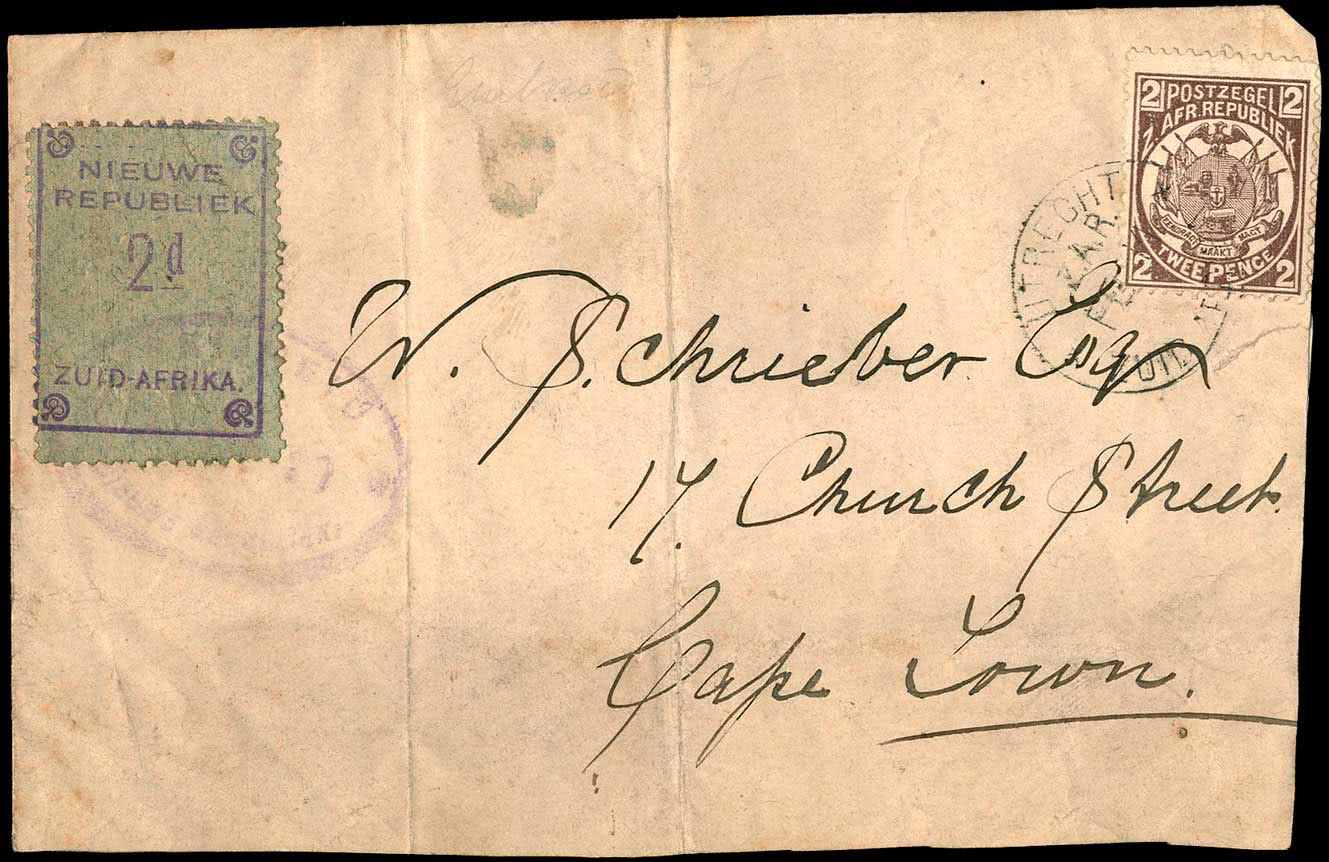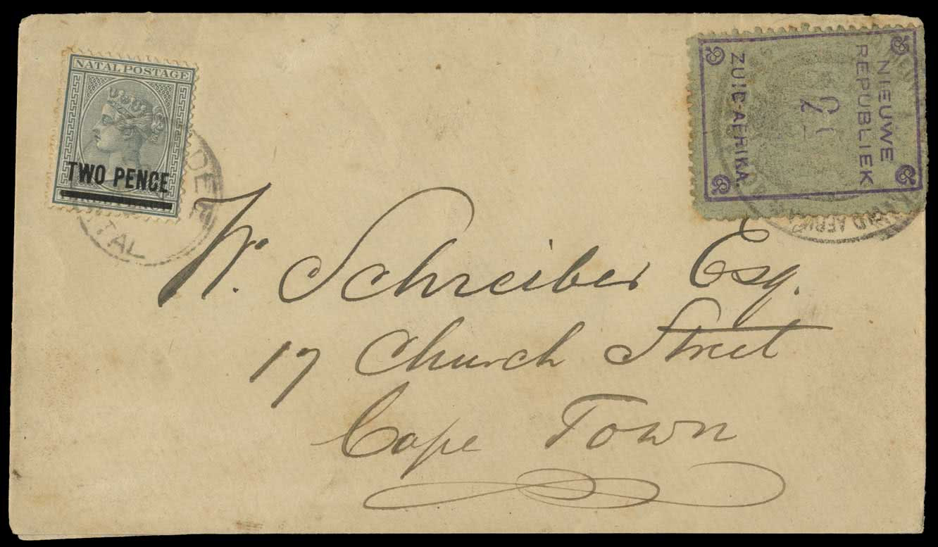 Postally used examples are rare but fiscally used material is much more common before the territory became part of Natal. New Republic stamps were never accepted for postage use internationally. Most use was domestic and fiscal. Depending on the route taken, (ZAR - Utrecht) or Natal - Dundee) external mail required ZAR or Natal stamps used in combination with New Republic ones. Below are two remarkable items recentlly sold by Grosvenor Auctions which perfectly illustrate international postage rates from the New Republic. Whoever snapped these up acquired remarkably scarce late 19th century rarities. Genuine postally used classics such as these are rarely seen!