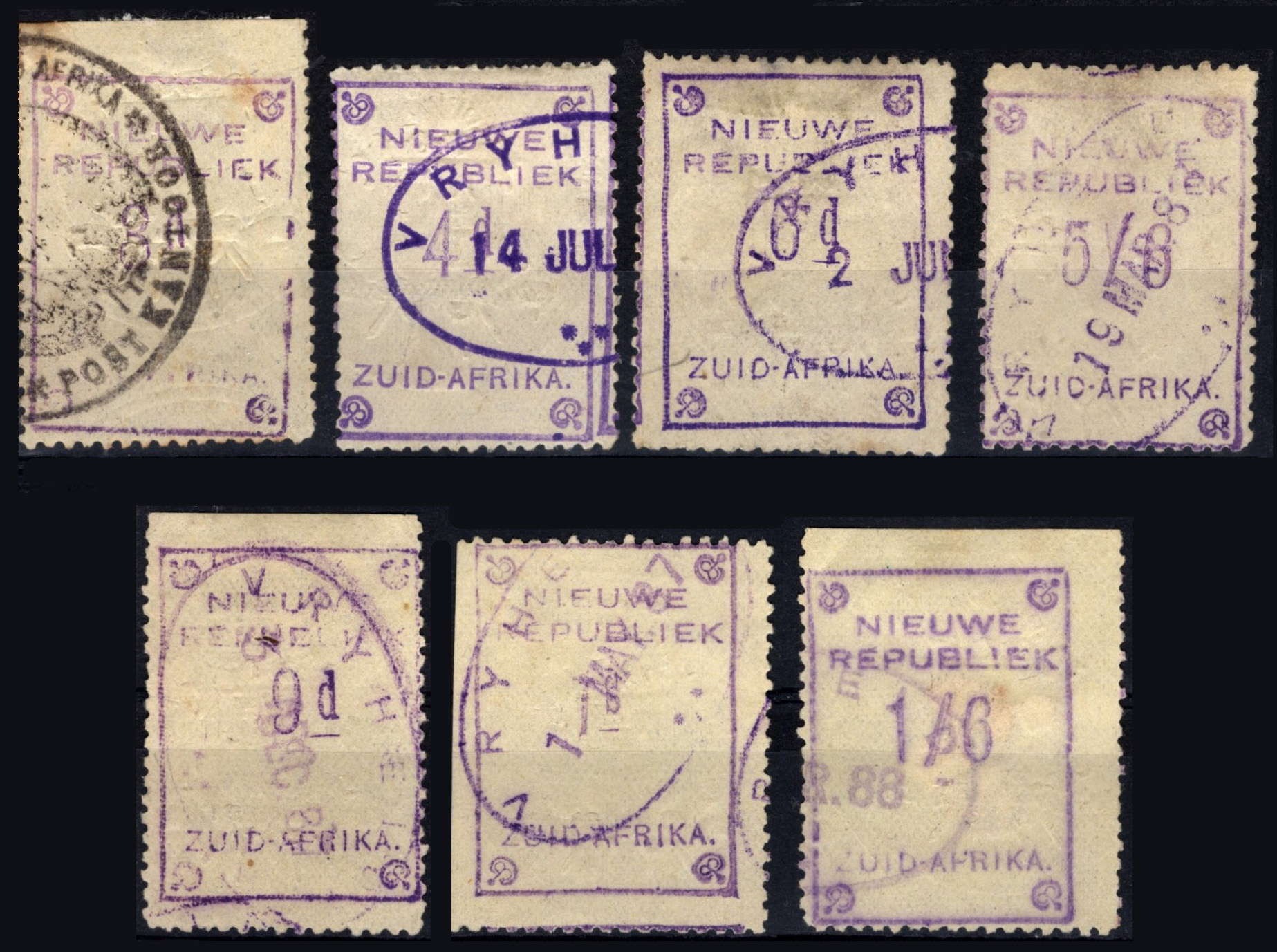 (Ex-Grosvenor Auctions.)New Republic stamps are divided into numerous categories on either yellow or granite paper with or without dates. These rather plain and unattractive stamps are generally diminished by wear, tears, thins, faults, general grubbiness and poor strikes when postally used. Of the seven stamps below all but one is cancelled with the more common VRYHEID violet oval dated handstamp. Both of the two types of this handstamp can be seen in the top 2nd and 3rd stamp along. Refer to Putzel at base.
