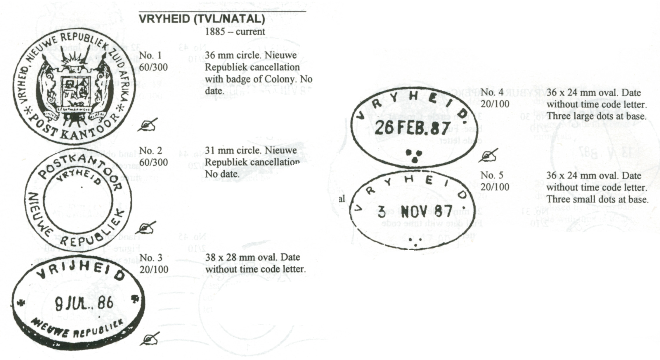 Additional handstampe one line cachet with the word 'Zegel' (Revenue/Duty).Below are the handstamps, datestamps and cachets recorded used in the New Republic by Ralph Putzel RDPSA, (The Postmarks of South Africa and Former States and Colonies.) The first three, Nos. 1 - 3, are shown on the covers above; the last two ovals with three large or small dots are both shown on the used stamps above.