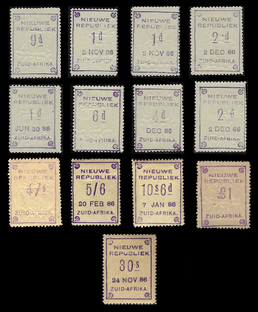 Nieuwe Republiek stamps were issued between 9th January 1886 and 13th January 1887. All stamps were handstamped using a rubber stamp in various shades of violet on pre-perforated, unwatermarked gummed paper. Designs have an outer frame line with NIEUWE / REPUBLIEK top, the value of the stamp in large letters in the centre, often date below the value and ZUID-AFRIKA at bottom.