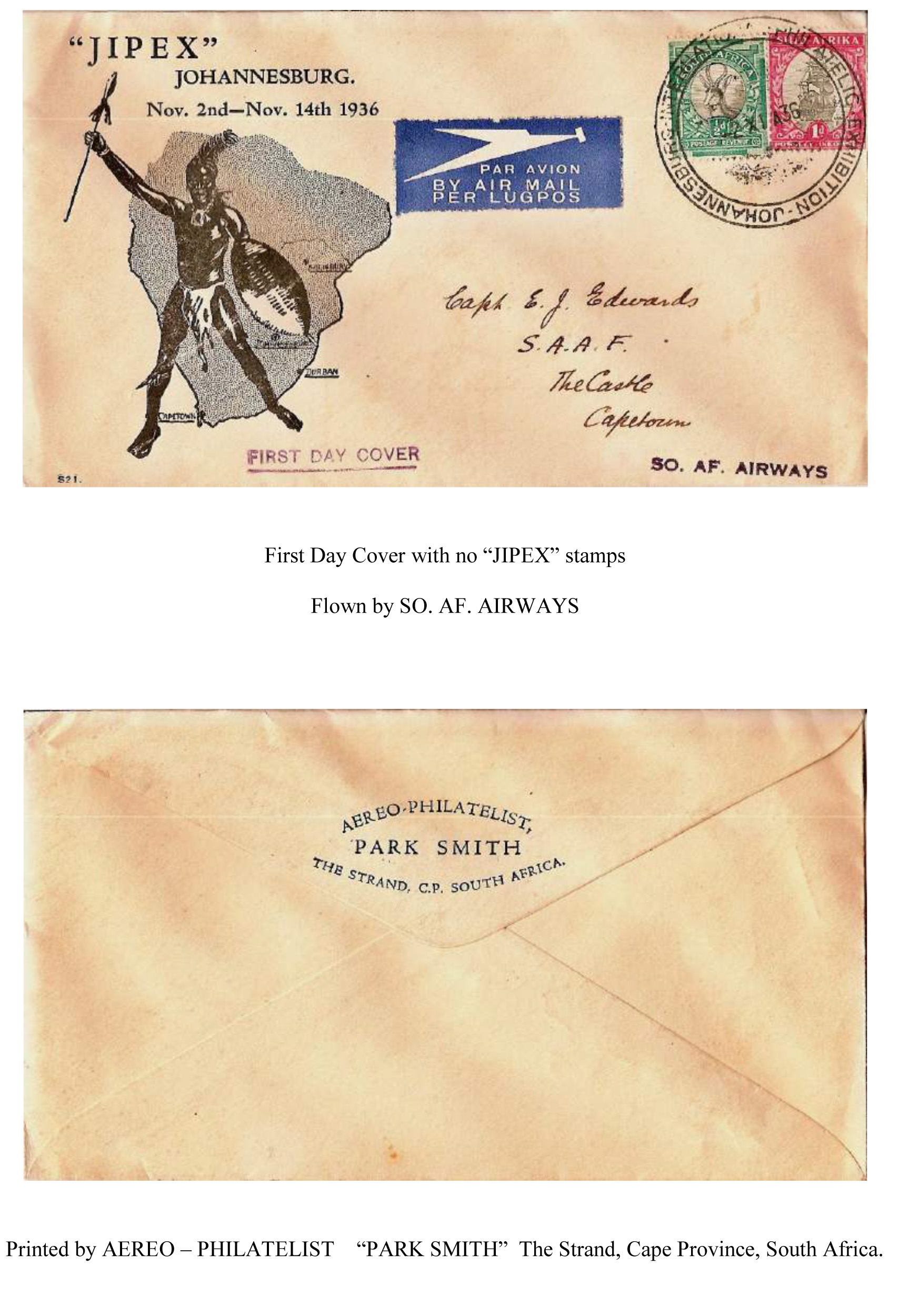 There are a number of covers associated with this exhibition which Roy shows. The official covers are dealt with in their own section. The cover below is an unofficial one which is dealt with separately at the end of the display ie. scroll down to the bottom. It shows a 'natve; warrior, most likely a Zulu. These covers are uncommon but not rare. Roy's suggestion in the caption at the bottom of the cropped display page image below is that these covers were privately printed by Park Smith, Aero-Philatelist, The Strand, C.P., South Africa. If true, this is for me, at any rate, a new discovery about Park Smith and the origin of these particular JIPEX covers.