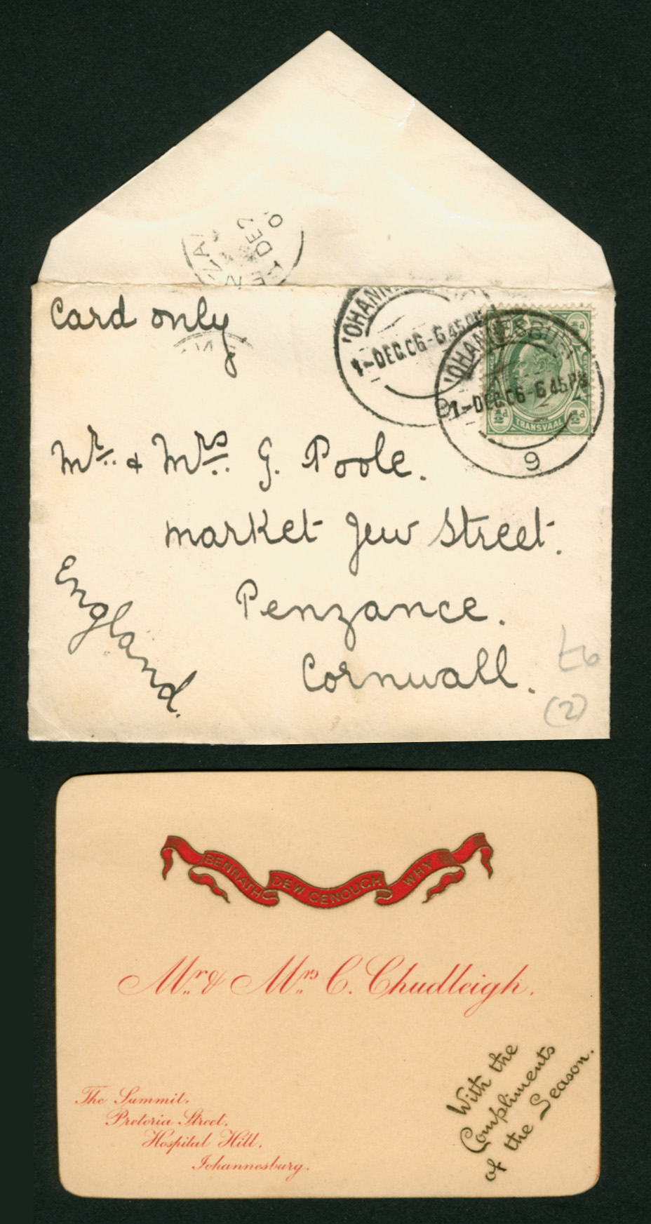 Chudleigh (right) was a successful merchant and draper in 1906 when this letter was posted. He was a co-founder of the well-known soft goods store, Chudleigh Bros, on the corner of Eloff and Pritchard Streets. A leading figure in Johannesburg's commercial life, he is considered to have been a prominent and influential force in the development of the City of Gold. His unwavering optimism played a crucial role in the city's growth after the South African War (1899 - 1902) and before Union when he was Mayor of Johannesburg from 1908 to 1909. "The Summit" was likely the name of a significant residence or property belonging to him located in or near the prestigious Hospital Hill area, which was a desirable residential area for the city's elite at the time, one with a good view both north (to Pretoria) and south.