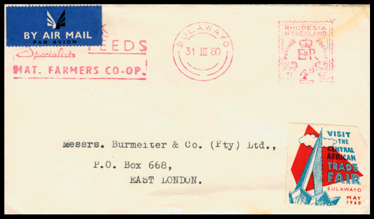 Sent at the 4d rate. Machine cancelled 'BULAWAYO RHODESIA NYASALAND' with slogan obscured by Air Mail Label.
