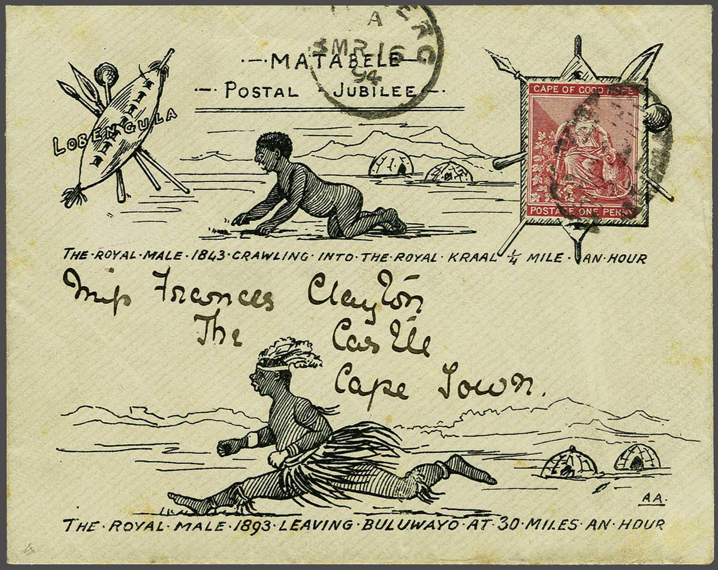 Corinphilia described it as "1884/90: 1 d. rose-red used on Matabele Postal Jubilee illustrated envelope, loosely based on the Great Britain 1890 illustrated envelope, mailed from Wynberg to Cape Town tied by numeral obliterator with 'Wynberg' cds at top (March 16, 1894). Reverse with Cape Town arrival cds of the same day. A charming cover.rnrnProvenance: 'Rectangular Issues', Spink, Sept 2007, lot 99."