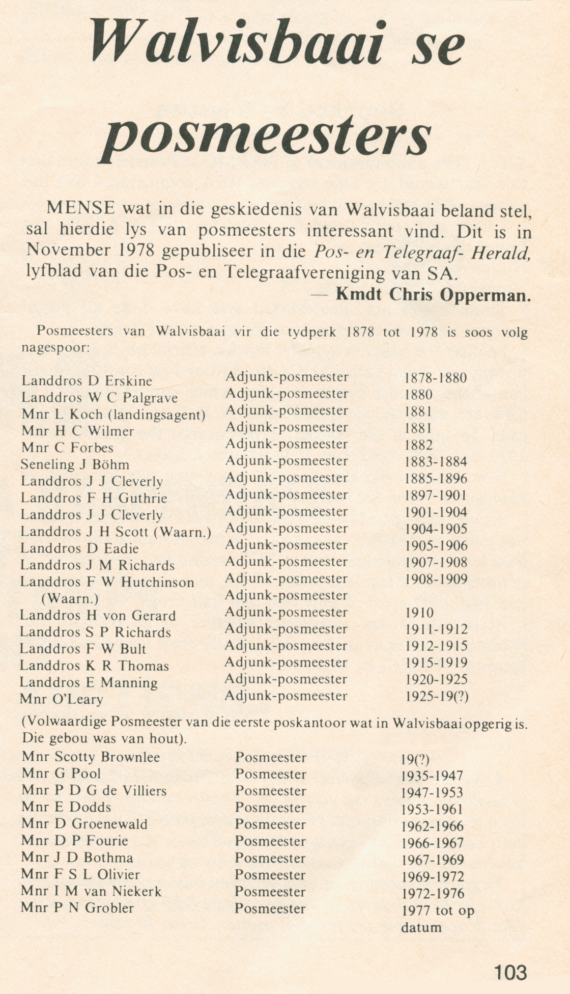 Quote from Steve on November 24, 2025, 5:57 pmPostmasters of Walvis Bay 1878 - 1978