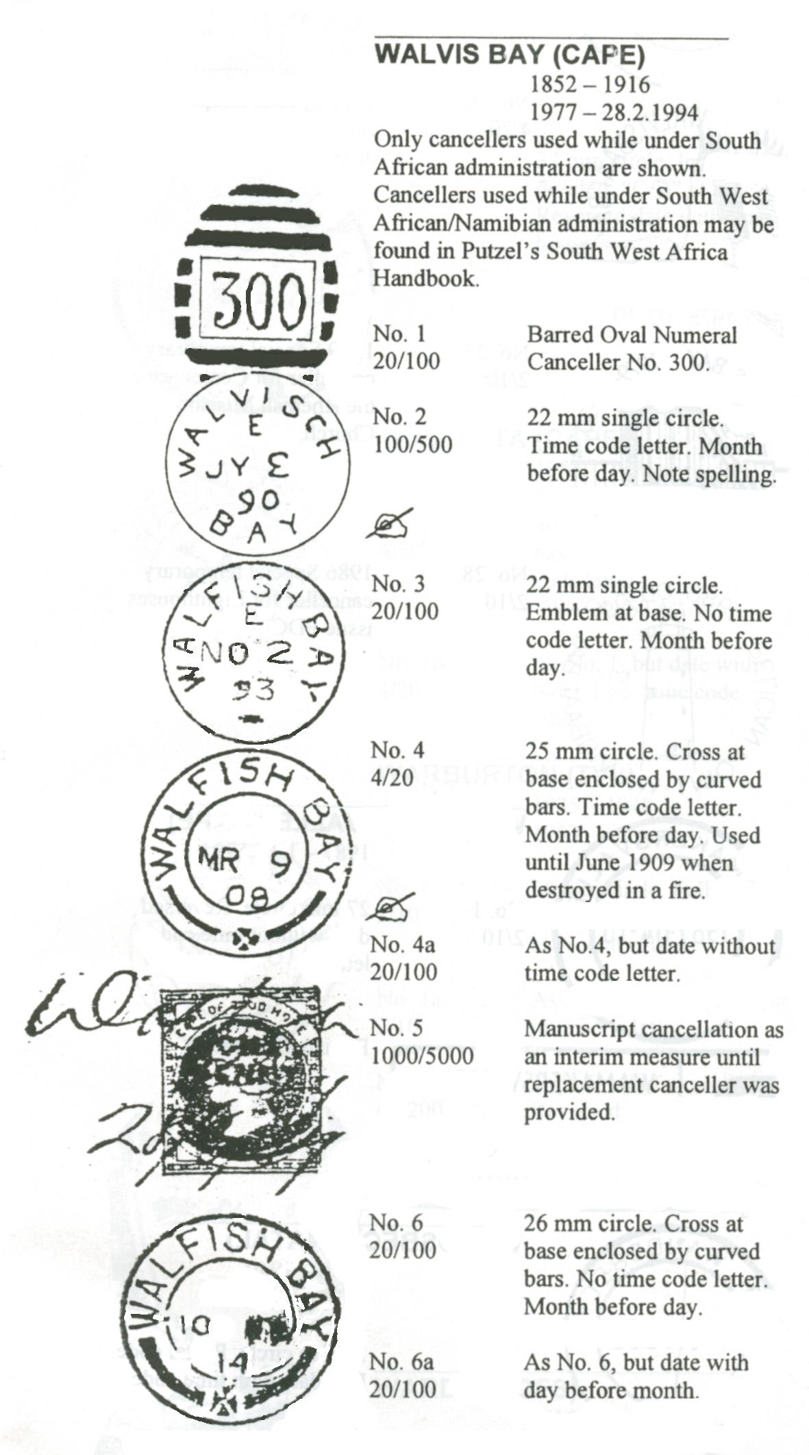 A Brief History of Walvisch / Walfish Bay Cancellers Possibly Relating to the Fire of 1909.I have used Ralph Putzel's 'The Postmarks of SA' which shows examples of the postmarks and F/V (Frescura / Visser) 'Revised Listing of the Post Offices and Postal Marking of the Cape of Good Hope 1792 -1910', (Second Post Publication Draft, 09.23) which does not show postmarks but which does show Earliest Recorded (ER) and Last Recorded (LR) dates of postmark use, which Putzel does not.
