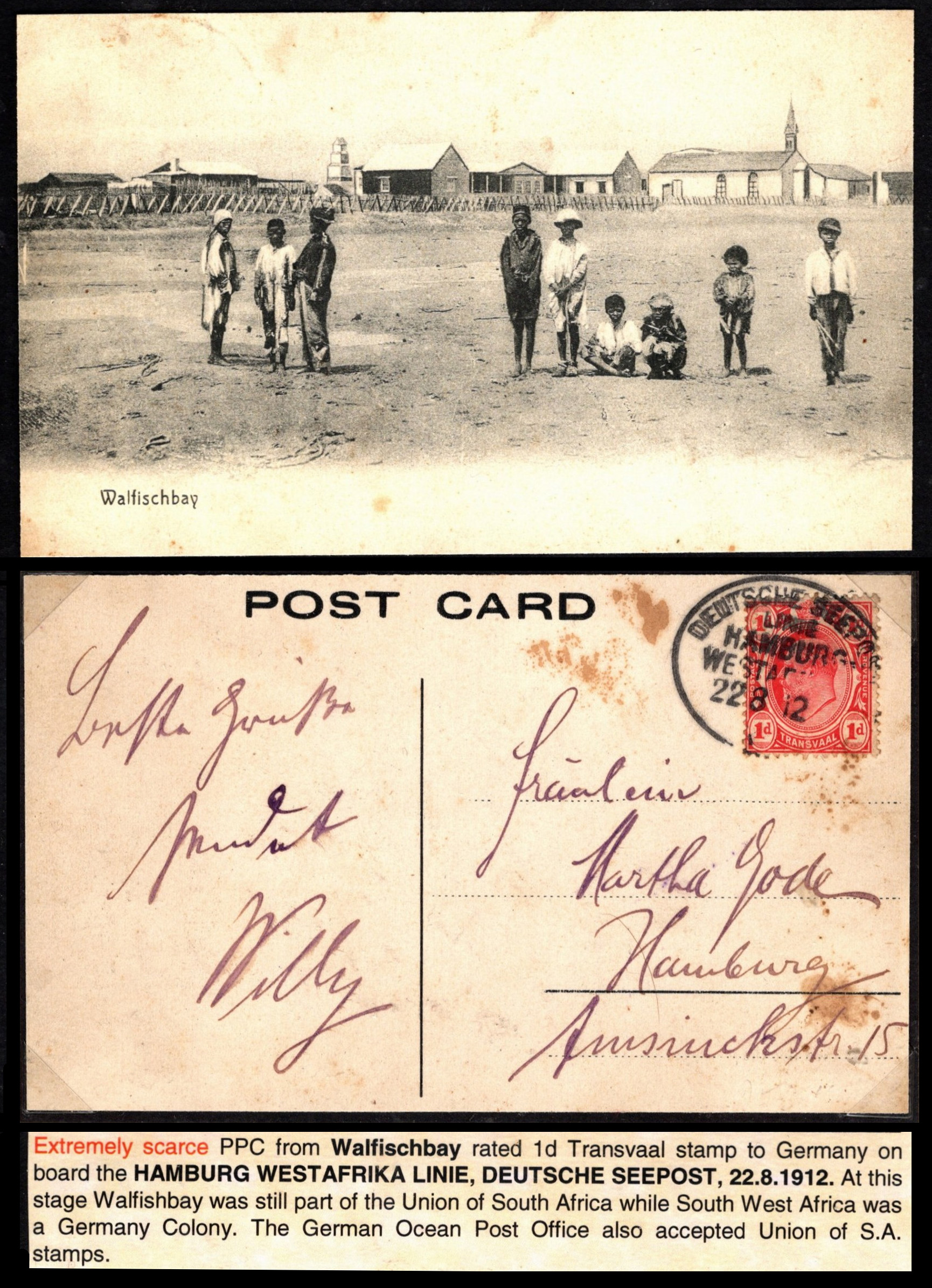 In 1909 a fire on the night of 22/23 June, destroyed the Post Office and other offices at Walfish Bay, an exclave of the Cape Colony on the South West African coast. It is generally believed this fire destroyed the Walfish Bay Post Office's datestamp. This required all outgoing mail between 23rd June and 5th July to receive a manuscript cancellation. Covers or postal stationery from this time that are cancelled by hand in Walfish Bay are highly collectable. I have seen several such items. They are seldom accompanied by a full and accurate description of the fire. The issue of how and when the lost datestamp was replaced is muddled, to say the least.