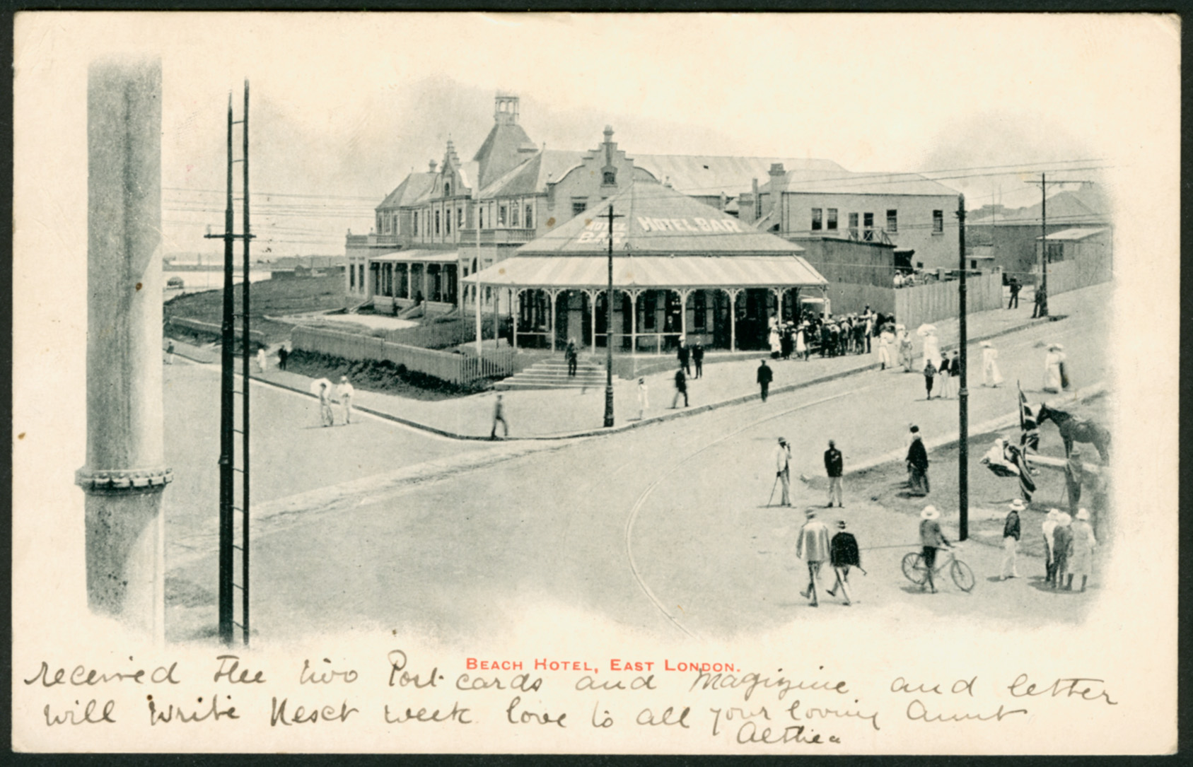 This postcard of the Beach Hotel, East London, is a side view, most being photographed looking towards the main entrance, left.