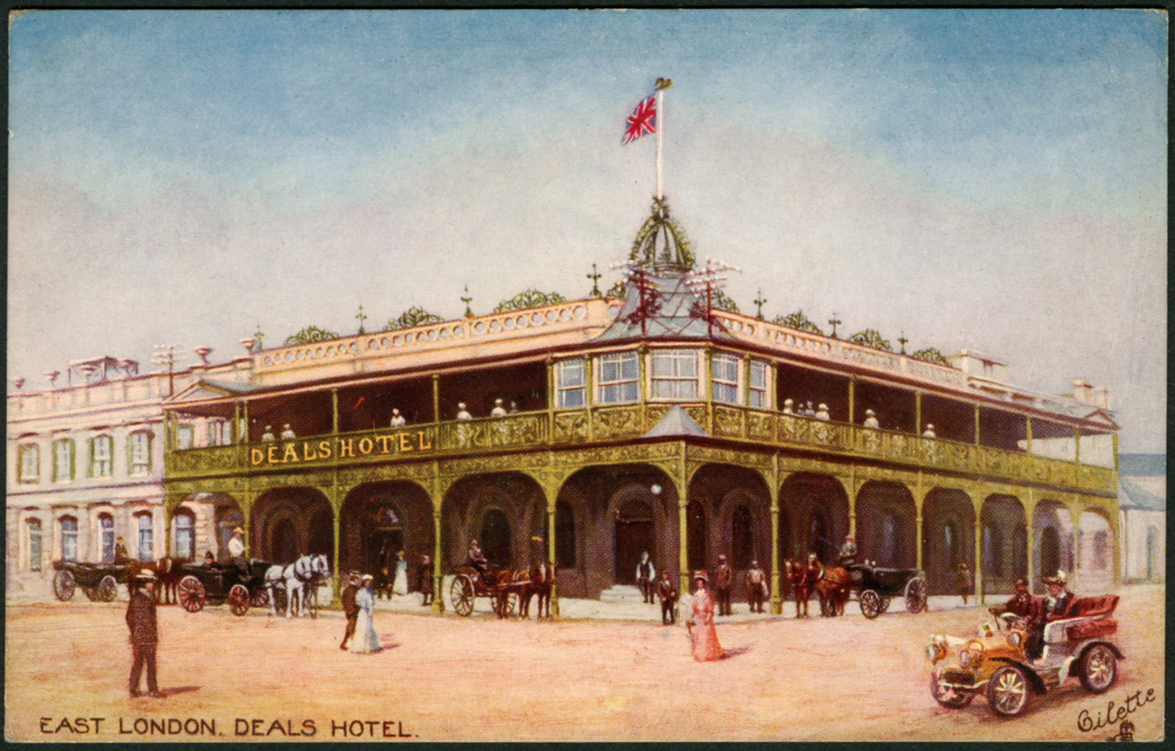 There are at least three different postcards that show a view of this, the first Deal's Hotel in East London. It is thought to have stood on the corner of Terminus and Oxford Street. The two other postcards are early black and white ones showing horse-drawn transport outside. Both are titled 'Deal's Central Hotel, East London' (G. G. Deal, Proprietor.). As this, the third postcard, is in colour ('Oilette') and shows a motor car it the most modern. I have not been able to find a date for its construction. The postcard was mailed in 1906.