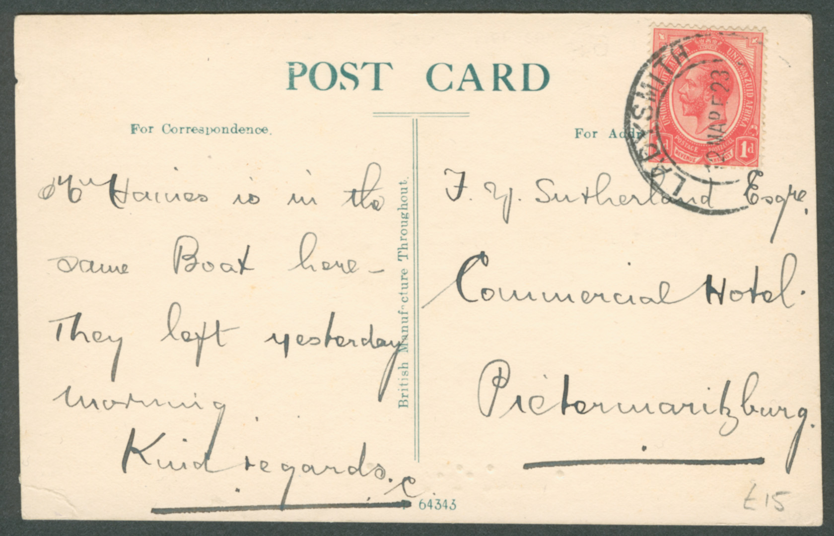 The addressee, F. Sutherland, is presumably an Englishman. 'Home' is presumably 'Blighty'.Note the optimistic price of £15 on this card. This is presumably based on 'Ladysmith Siege' interest! It's not really worth it However, after doing a little research into the hotel's history, I realised that this postcard is key to a wonderful tale of colonial and imperial life and death.