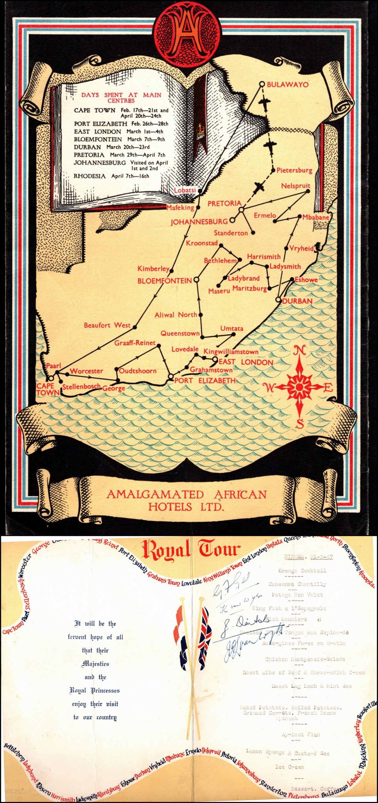 The item below, a 1947 Royal Tour brochure, is said to have been "produced by the Kings Hotel, East London". This was more likely produced by the Amalgamated African Hotels group and supplied to their hotels for their use as a menu card. There is no mention of any specific hotel in this brochure, only of the group. This would have saved on the cost of individualising the brochure for each hotel.