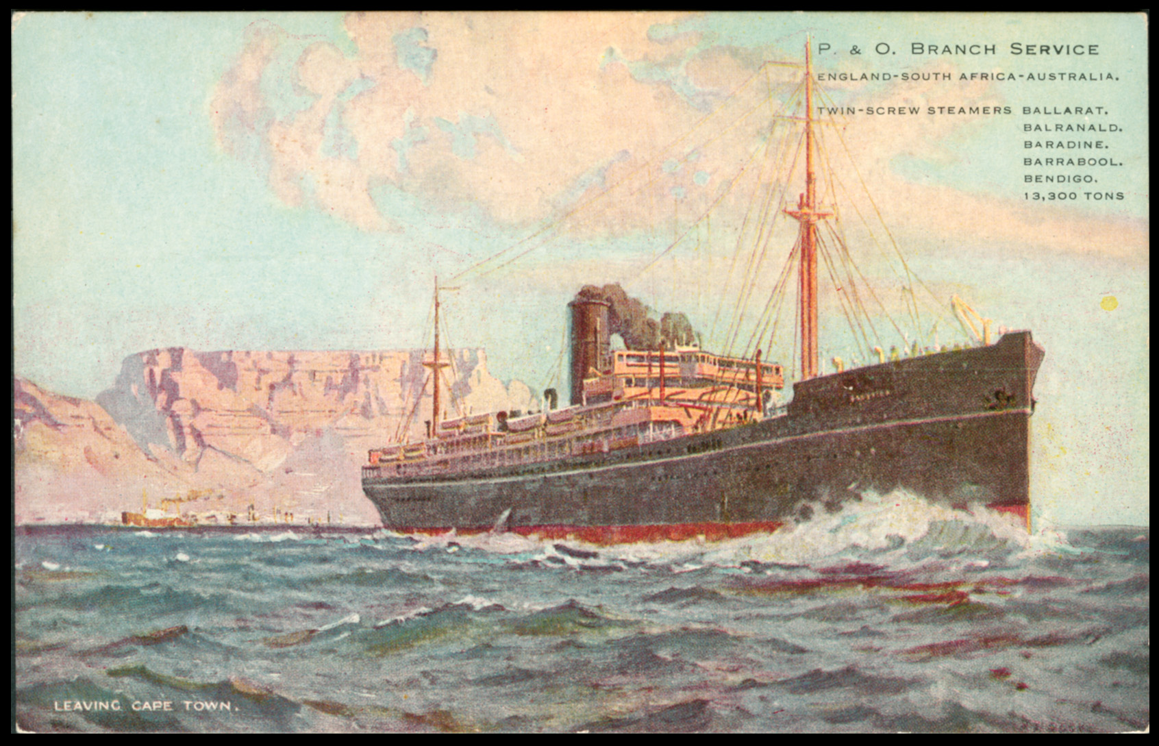 It's Cape Town, of course, but which ship is it? I suspect Baradine, named after a town in northeast New South Wales, Australia. Launched in 1921, Baradine was the first of the post-WW1 ‘B’ class vessels to enlarge the P&O Branch Line emigrant service via the Cape to Australia. Her maiden voyage was on 21 09 1921. She remained on the Cape route until 1929, despite reduced emigrant traffic after 1926.
