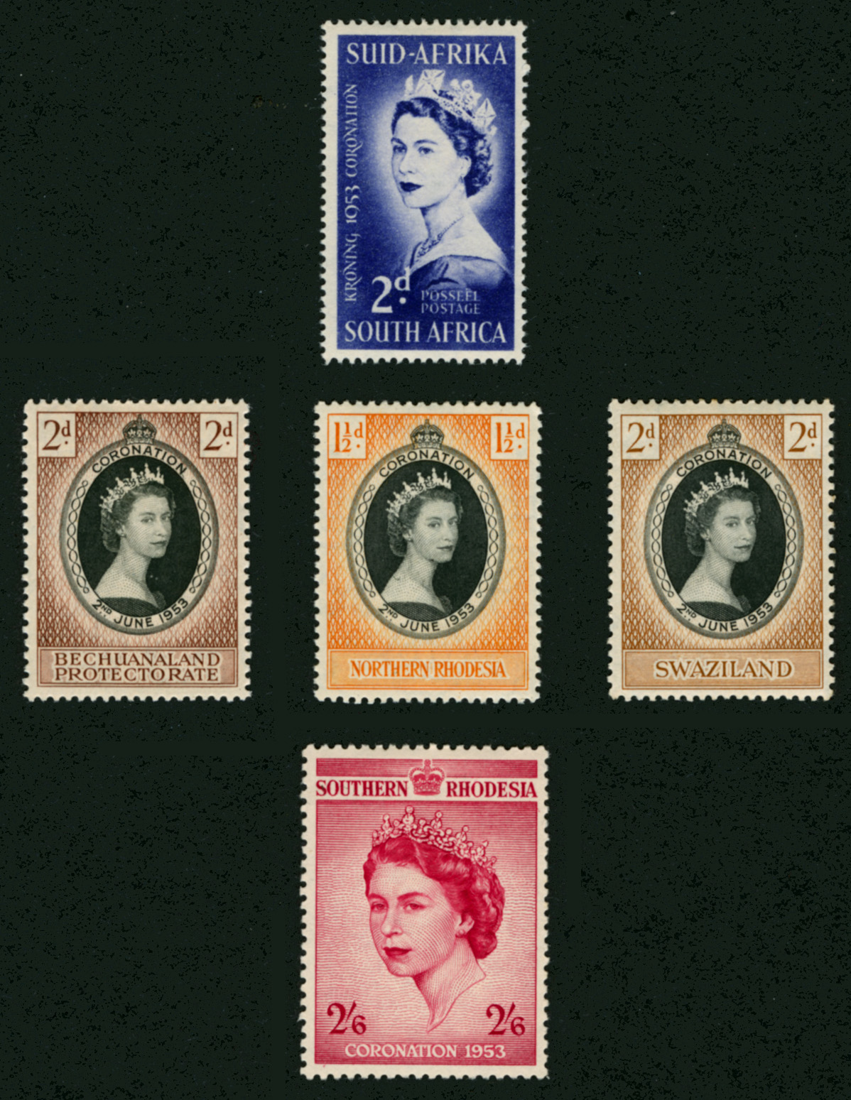 All the 'British' countries of southern Africa produced stamps to commemorate QE2's Coronation. Some samples are shown below. Missing is the Basutoland stamp which is a black and reddish-purple version of the three central stamps below, a design widely used in Brtish colonies. Also missing is the dull set of five SWA values issued on 2nd June, the day before the Coronation. They are arguably the least attractive of all the QE2 Coronation issued worldwide. Perhaps for that reason it is a good thing not to show them here. I like the South African design a lot but my absolute all-time favourite is the Southern Rhodesia 2/6d.